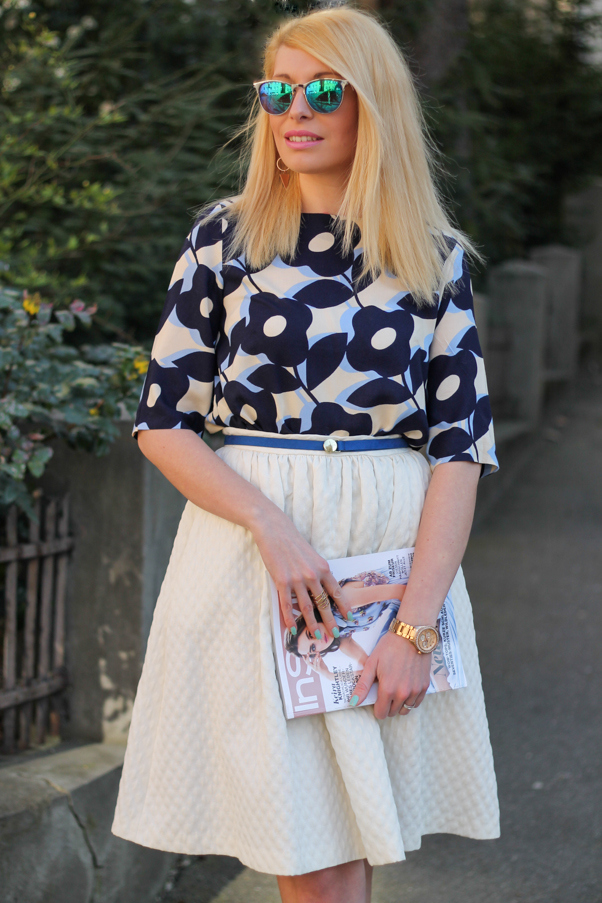 To tell you a few words about these outfits now, I chose to wear my white midi skirt because I missed wearing it and I wanted to mix it with some blue clothes since light blue (serenity) is also this year's color and since I had so much pink lately on the blog :D. Turns out I couldn't stay away for too long (look below) haha, but blue still takes this post over. I got the floral top last spring but I didn't manage to show it to you until now. It is sort of a crop top, very flowy and soft and I love its pattern and the fact that it has several shades of blue, which enabled me to mix it with a light blue coat and a dark blue pair of shoes. This is definitely something I would choose to wear on Easter or at a daytime party/celebration/garden party.