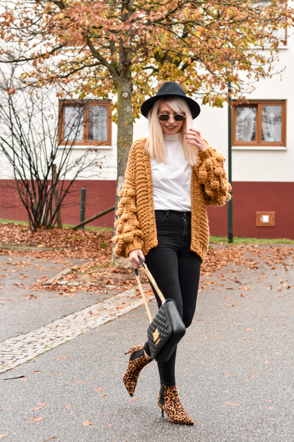 I paired the cardigan with a black & white look, but in the end I added my leopard print boots and a hat in order to make this outfit look a little more sophisticated. I find this OOTD to be just right for fall, for a day in the city, for shopping or meeting a friend for coffee / lunch, for a walk and even for the office if you lose the hat :). You can find the cardigan HERE, also in white, black, brown, pink, grey, etc.