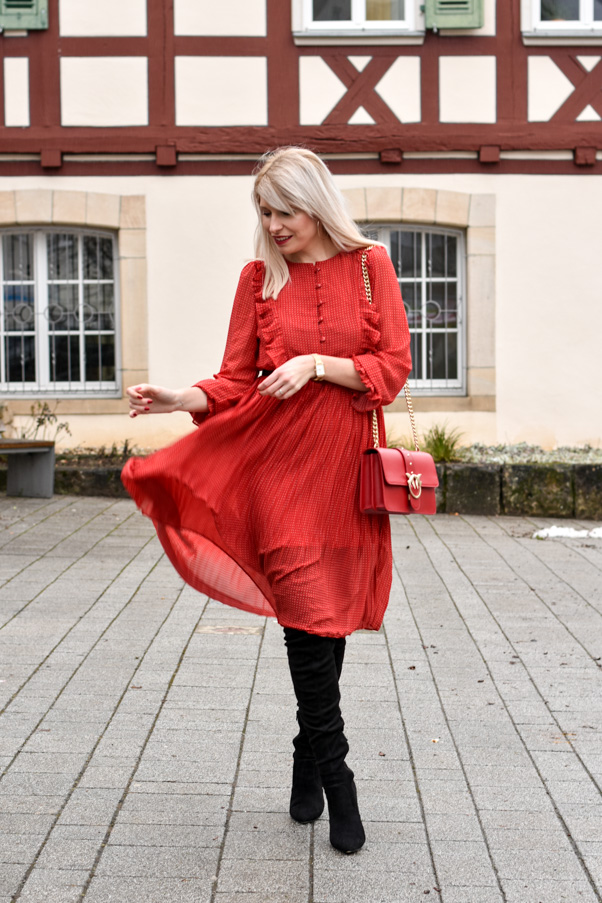As you can see I chose to pair it with some over the knee boots, my fluffy warm black coat and a red bag.